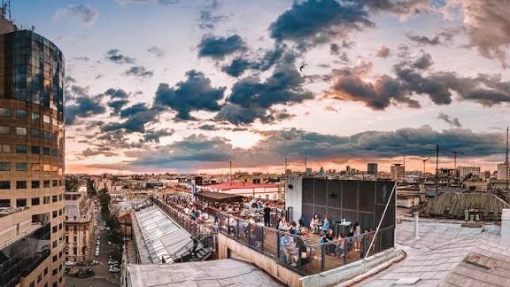 - Pura Vida Sky Bar – Pentru o atmosferă mai tinerească și boemă, Pura Vida din Centrul Vechi este alegerea perfectă. Aflat pe acoperișul unei clădiri istorice de pe Strada Smârdan, acest sky bar are un aer boho-chic, cu perne colorate, mobilier din paleți și priveliște spre acoperișurile dantelate ale centrului vechi. Recomandare: încearcă un cocktail tropical (mojito sau pina colada) sau o limonadă de casă și admiră forfota de pe Lipscani de sus. Prețuri: bere/cocktail 15–40 lei; gustări 20–35 lei. Fiind asociat cu un hostel, Pura Vida atrage mulți turiști, așa că vei auzi limbi diferite și vei simți o energie cosmopolită. Serile de vară aduc adesea petreceri cu tematică sau jam session-uri acustice. Cei care vin aici iubesc vibrația relaxată: nimic nu se compară cu a sta pe un bean-bag, sub luminițe și ghirlande, privind luna deasupra Hanului lui Manuc. „Acest loc știe sigur cum să-și facă simțită prezența: beat-uri electronice alternative și dans sub cerul liber, sub o umbrelă de viță de vie” descrie poetic un vizitator experiența de la Pura Vida . Nu te aștepta la lux, ci la good vibes & good view – motto-ul neoficial al acestui rooftop accesibil, unde toată lumea se simte binevenită. În zilele cu soare sau în serile calde, Pura Vida Sky Bar oferă poate cea mai “relax” panoramă a Bucureștiului, la un pahar de vorbă și unul de vin.